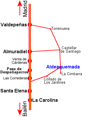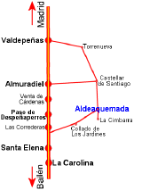 - Opción A: Bajar por la Carretera Nacional IV y salir en Valdepeñas. Seguir hasta Torrenueva y Castellar de Santiago. El siguiente pueblo es Aldeaquemada.