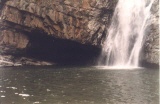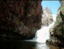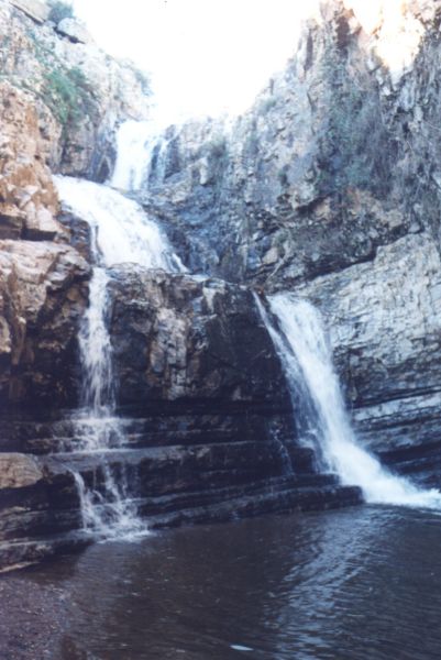 - Circulando de nuevo por el transcurso de un río poblado de barbos y cangrejos -que hasta hace poco tiempo siguieron siendo del tipo autóctono español- llegamos a la Junta de los Ríos, lugar en el que se unen el Guarrizas y el Martín Pérez. Optaremos por tomar el Martín Perez hacia arriba (tengamos en cuenta que lo único que estamos haciendo es darle la vuelta al cerro de La Plaza de Armas) hasta llegar al Cimbarrillo, otra cascada de agua con lecho de arena y una fuentecilla donde apagar la sed. A quienes han dormido allí por primera vez, siempre les asusta una enorme roca que asoma por el borde superior y que parece que caerá en cualquier momento. Nuestro miedo desaparece precisamente en el momento en el que subimos arriba y comprobamos que el trozo que asoma tan solo es un piquito correspondiente a una piedra más grande que lleva allí siglos colocada.